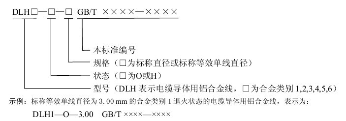 華星合金電纜根據企業標準規定型號以供客戶選擇,如ZC-TC90表示為AA8030合金導體交聯聚乙烯絕緣聚氯乙烯護套0.6/1kV電力電纜。即將頒布的國標《低壓電纜用鋁合金線》中對型號做了新的規定,其規定如下圖: